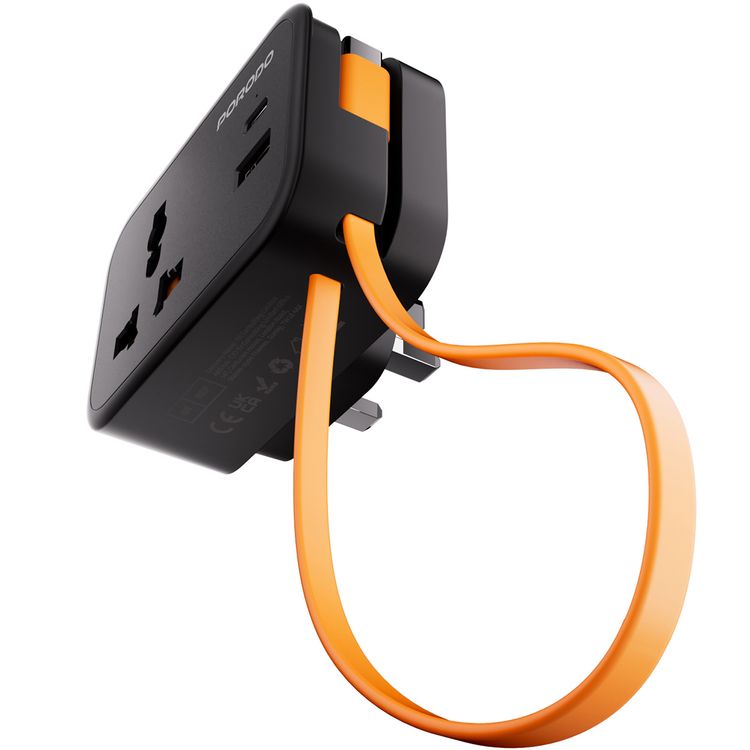Porodo Universal Wall Socket with 30cm Built-in USB-C Cable, Simultaneous Charging, 20W PD, 18W QC, Fireproof Material, Fuse Protection, UK 3-Pin Plug - Black