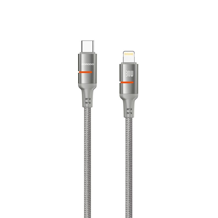 Porodo USB-C to Lightning LED Light Cable with 30W Power Delivery, 480Mbps Transfer Speed, 1.2m Cable Length, Fast Charging & Data Transfer, Braided Wire - Gray