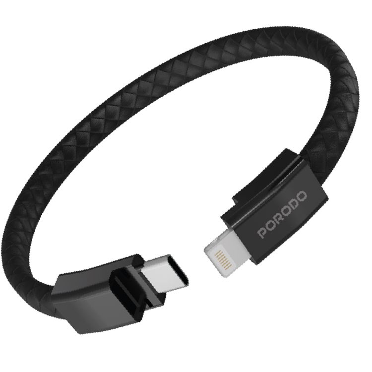 Porodo USB-C to Lightning Wristband Cable with Magnetic Steel Clasp, 27W Power Delivery, 480Mbps Data Transfer Speed, Wearable Design, 20cm Cable Length, PU Leather & Zinc Alloy Material - Black