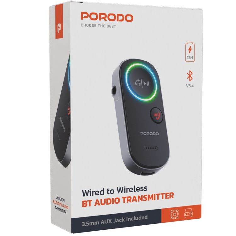 Porodo Wired to Wireless BT Audio Transmitter with Voice Assistant, Hands-Free Calls, 3D Surround Sound, 2 Hours Recharge Time, Up to 12 Hours Working Time, 150mAh Battery - Black