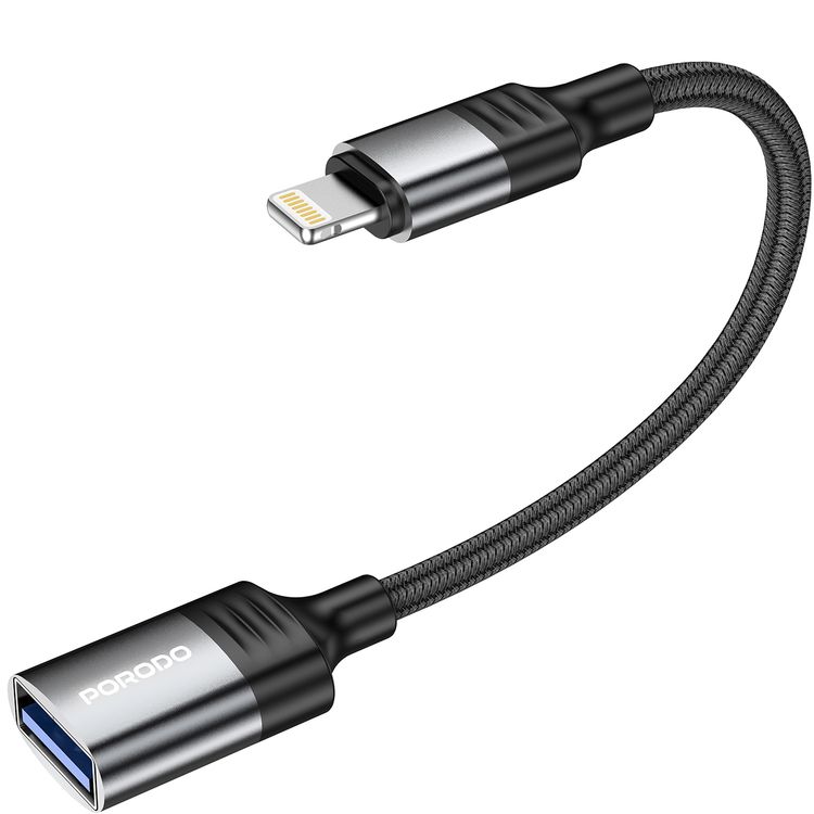 Porodo Lightning OTG Wire, 12cm Cable Length, Up to 480Mbps Data Transfer Speed, Braided Cable, Compatible with Lightning Devices, Plug and Play - Black