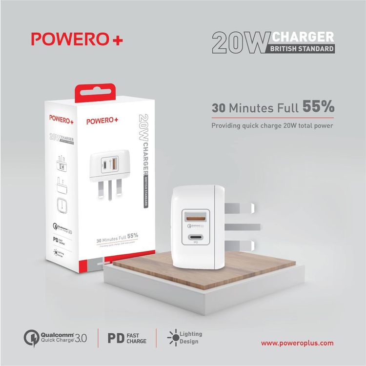 Powero+ Wall Charger - British Standard Charger 20W with Type-C Port & USB-A Port - Compact & Durable Fast Charging Portable Adapter with Intelligent Protection System - White