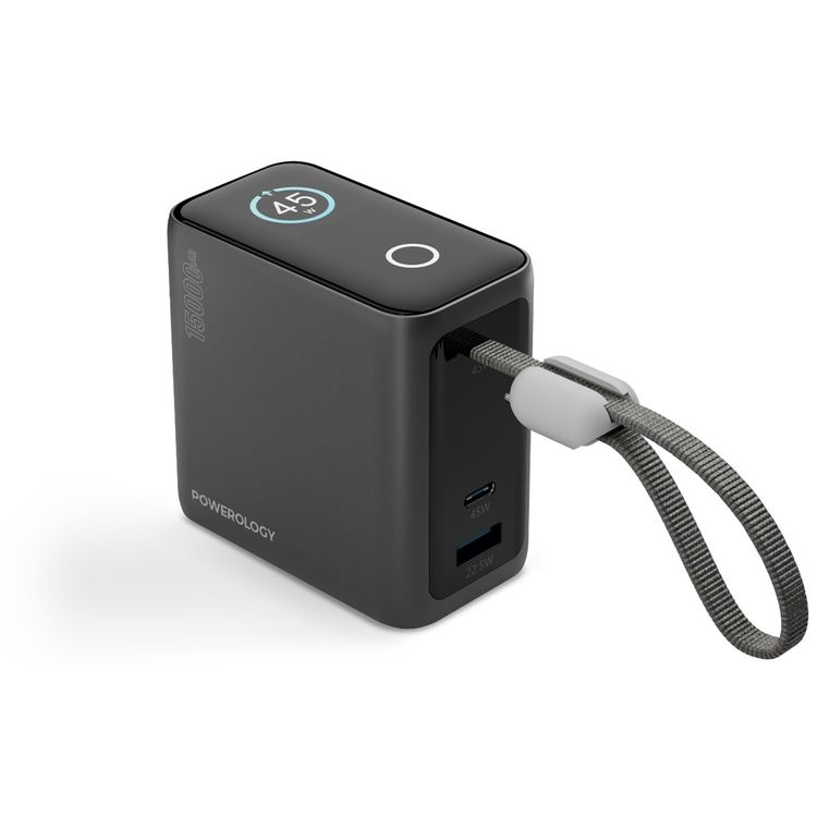 Powerology 15000mAh Mini Power Bank with Multiple Charging Ports, Universal Compatibility, Advanced Safety Features, Smart TFT Display, Built-in USB-C Cable - Black