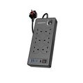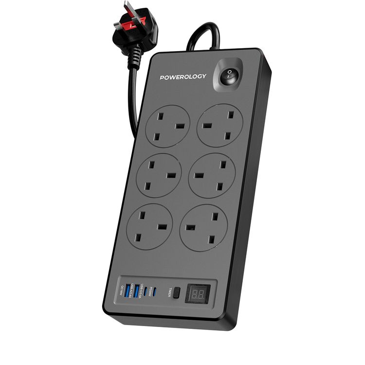 Powerology 2990W Power Strip with 6 AC Sockets, Dual USB-C & Dual USB-A Ports, UK 3-Pin Plug with 2m Length, Up to 99 Hours Timer Function, Digital Display - Black