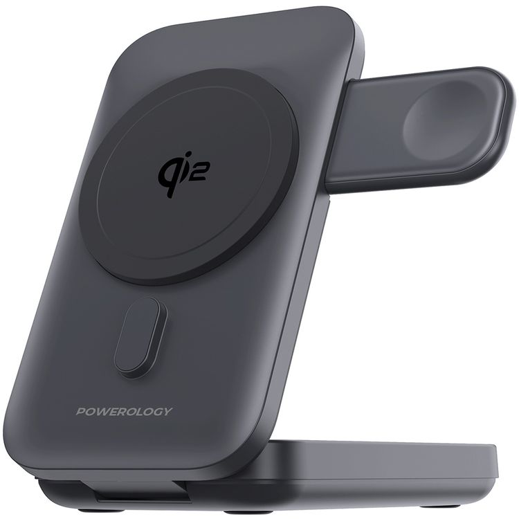 Powerology MagSafe 10000mAh Power Bank & Watch Charger with 15W PD, Qi2 Certified, Compatible with iWatch and Airpods, Foldable Stand - Black