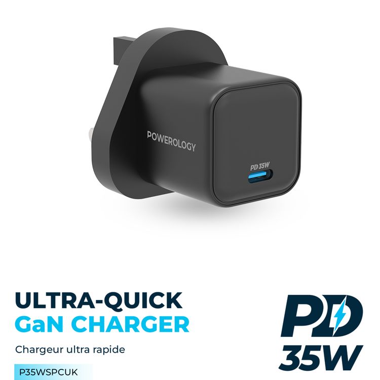 The Powerology 35W Ultra-Quick GaN Charger with UK Plug, USB-C Output Port, Fast Charge, Portable & Compact Design, Built-in Safeguards, 100-240V Input - Black
