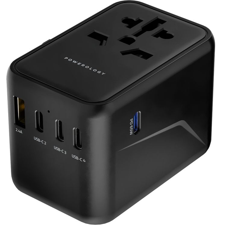 Powerology Universal Multi-Port Travel Adapter with 65W Power Delivery, Dual 10A Fuses, 12W USB-A Output, Laptop Charging Compatibility, Universal Plugs - Gray