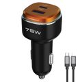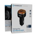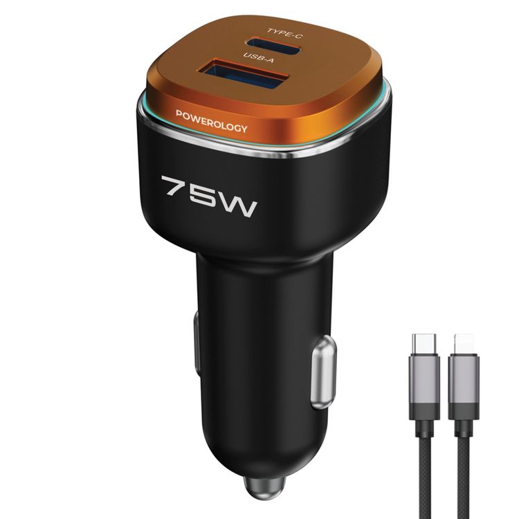 Powerology 75W Dual-Port High-Power Car Charger with USB-C to Lightning Cable, USB-C & USB-A Ports, 75W Total Output, 45W Power Delivery, LED Ambient Light, Fast Charge, Zinc Alloy with Oil Painting Finish Material - Black / Orange