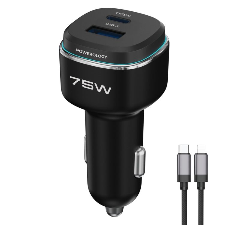 Powerology 75W Dual-Port High-Power Car Charger with USB-C to Lightning Cable, USB-C & USB-A Ports, 75W Total Output, 45W Power Delivery, LED Ambient Light, Fast Charge, Zinc Alloy with Oil Painting Finish Material - Black / Gray