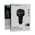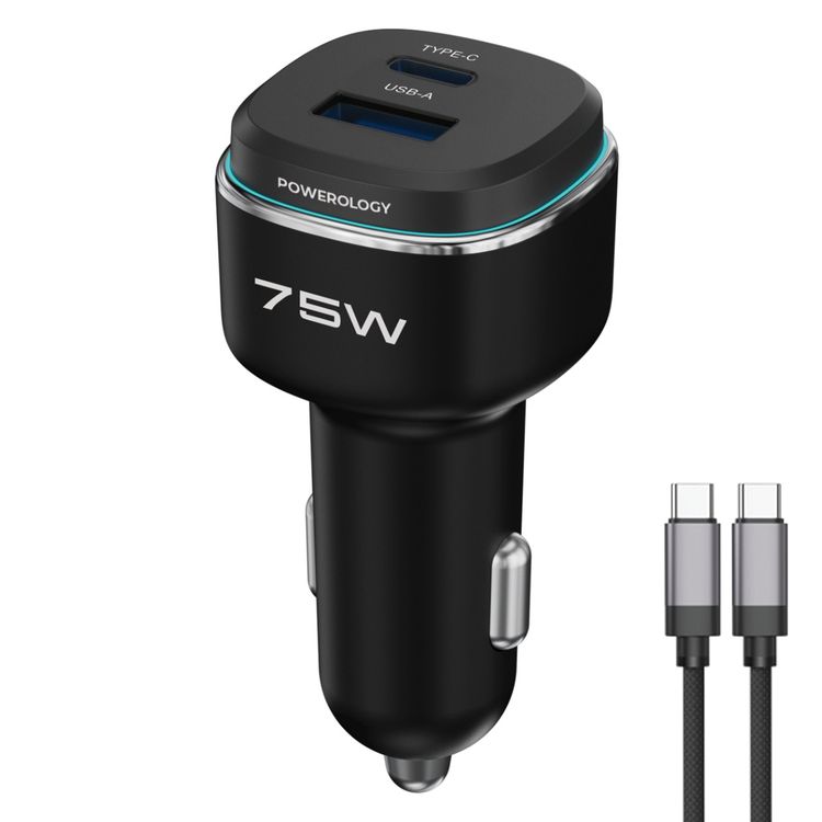 Powerology 75W Dual-Port High-Power Car Charger with USB-C to USB-C Cable, USB-C & USB-A Ports, 75W Total Output, 45W Power Delivery, LED Ambient Light, Fast Charge, Zinc Alloy with Oil Painting Finish Material - Black / Gray