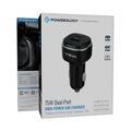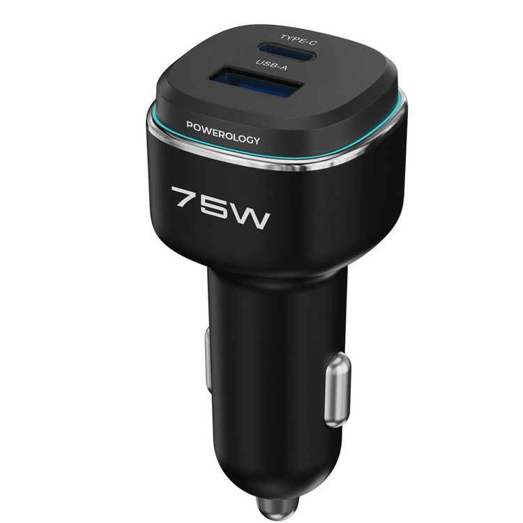 Powerology 75W Dual-Port High-Power Car Charger, USB-C & USB-A Ports, 75W Total Output, 45W Power Delivery, LED Ambient Light, Fast Charge, Zinc Alloy - Black / Blue