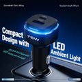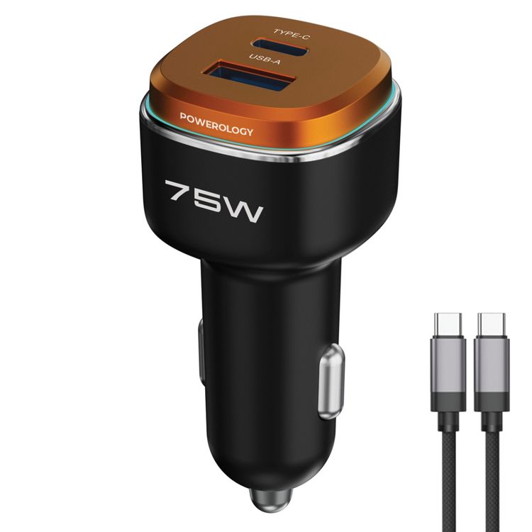 Powerology 75W Dual-Port High-Power Car Charger with USB-C to USB-C Cable, USB-C & USB-A Ports, 75W Total Output, 45W Power Delivery, LED Ambient Light, Fast Charge, Zinc Alloy with Oil Painting Finish Material - Black / Orange