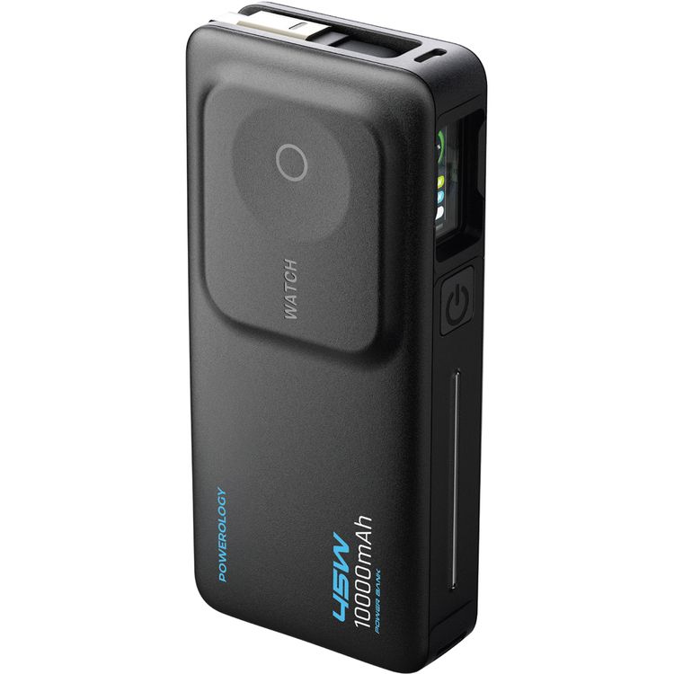 Powerology Astro 10000mAh Power Bank with PD 45W, Type-C Input/Output Ports, Multiple Device Charging, Built-in Safeguards, Watch Charger, 80cm Retractable Cable, Digital Display - Black
