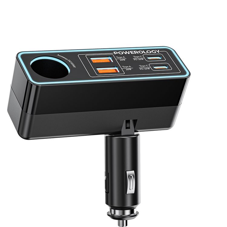 Powerology Brio Multi-Port Car Charger with PD 40W, QC 30W, ×2 USB-A & ×2 USB-C Ports, 125W Total Output, LED Ambient Lights, Simultaneous Charging - Black