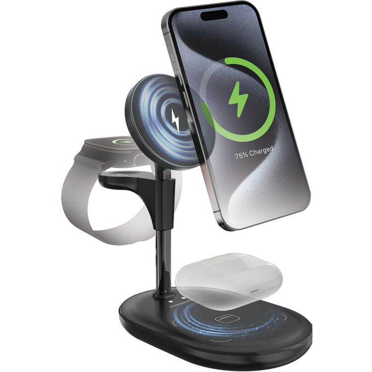 Powerology Floréa 3-in-1 Wireless Charging Stand with 40° Adjustable Viewing Angle, Up to 15W Phone Charging Output, 3W Earbuds Charging Output, 2.5W Watch Charging Output, 1m USB-C Cable, 360° Rotation, Stable Weighted Base, Strong Magnetic Hold - Black