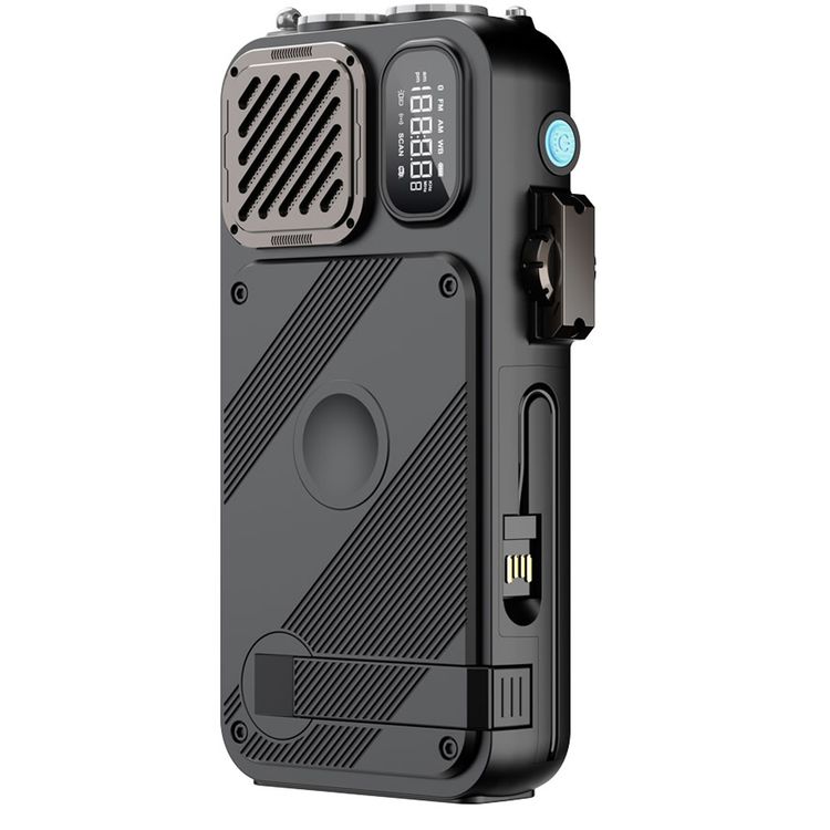 Powerology 16000mAh Solar Power Bank with FM Radio, Speaker & Lights, Compact Design, Bluetooth Version 5.3, LED Digital Clock, Integrated Cable - Black