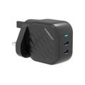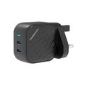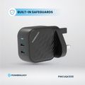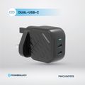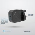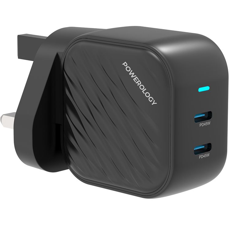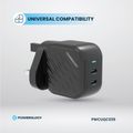 Powerology GaN Dual-USB-C Wall Charger with 45W Power Delivery, Built-in Safeguards, Universal Compatibility, 1.5A Rated Current, AC 100-240V Rated Voltage - Black