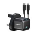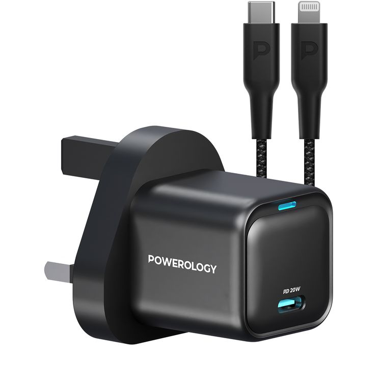 Powerology Ultra-Compact GaN Charger with Type-C to Lightning Cable, PD 20W, USB-C Port, Fast Charge Support, 3-Pin UK Plug, Compact & Lightweight Design, Build-in Safeguards, Universal Compatibility - Black