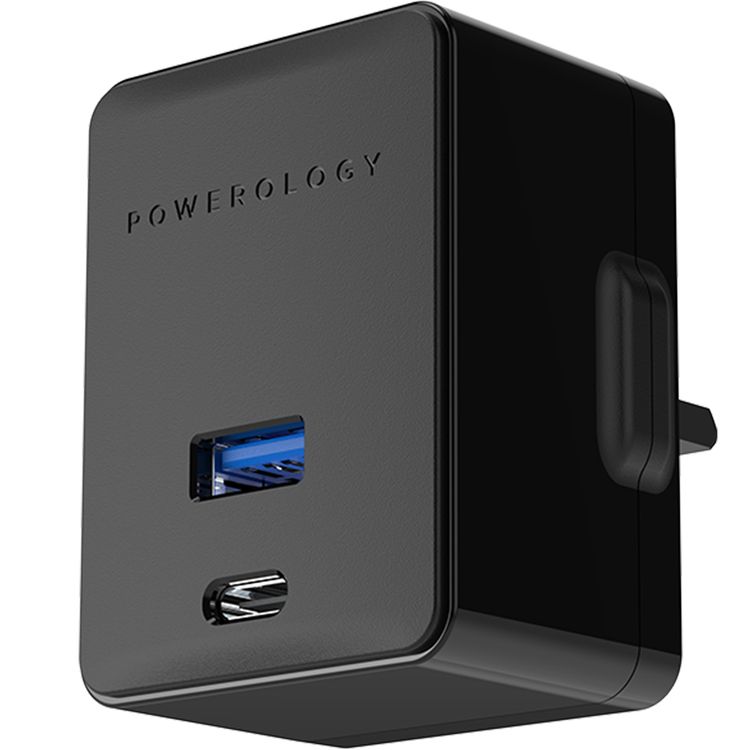 Powerology Ultra-Quick PD Charger with Simultaneous Charging, 36W Total Output, UK 3-Pin Plug, 0%-60% Charge in 35 Minutes, Fast Charging Support, PowerDash 3.0 - Black