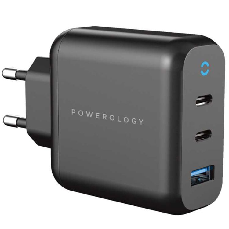 Powerology Compact 3-Output EU GaN Charger with 65W Power Delivery, Laptop Charging Compatibility, Reliable Companion, 0%-60% Charge in 35 Minutes - Black