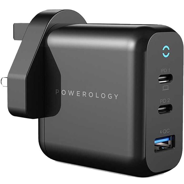 Powerology Compact 3-Output UK GaN Charger with 65W Power Delivery, Laptop Charging Compatibility, Reliable Companion, 0%-60% Charge in 35 Minutes - Black