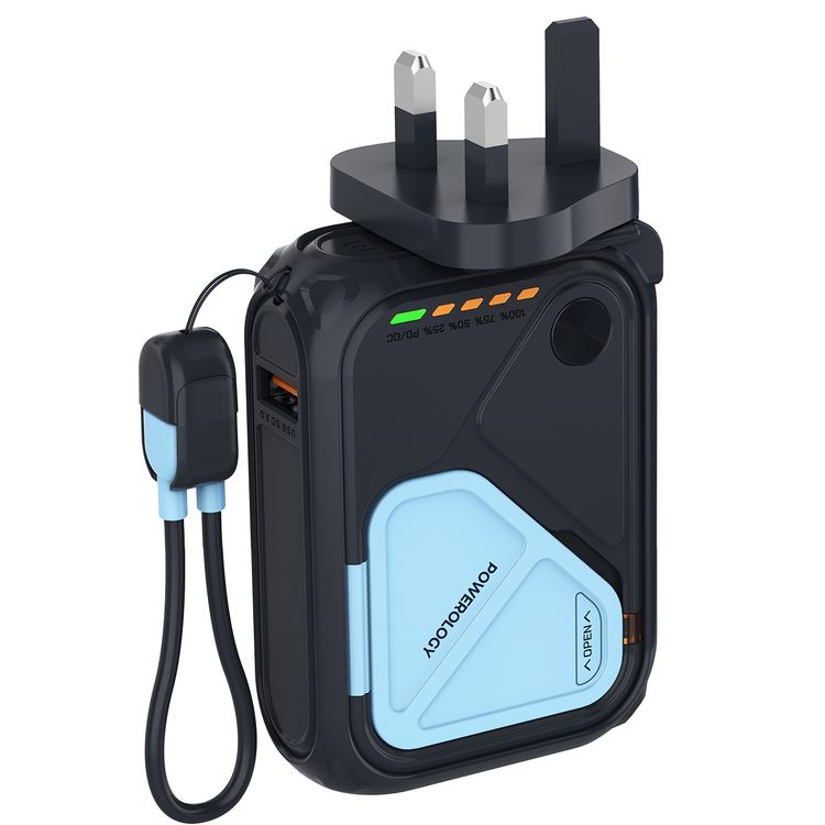 Powerology Wireless Power Bank 10000mAh with UK Conversion Plug, Power Delivery 20W, Simultaneous Charging, Built-in Kickstand - Black