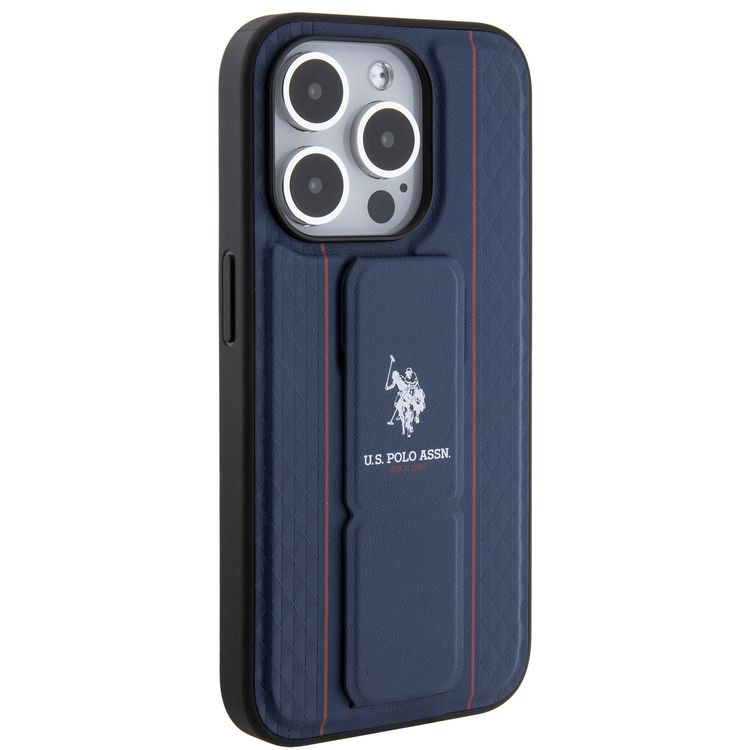 U.S.Polo Assn. PU Leather Textured Pattern Grip Stand Case for iPhone 15 Series - Navy - iPhone 15 Pro