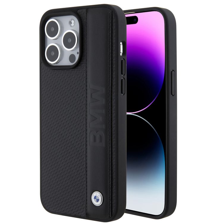BMW Leather Case with Sign Texture & Strip Pattern for iPhone 15 Pro