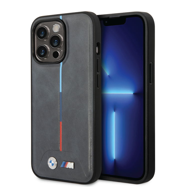 BMW M Collection Quilted PU Case with Hot Stamped Tricolor Stripe and Printed Logo iPhone 14 Pro Max Compatibility - Grey