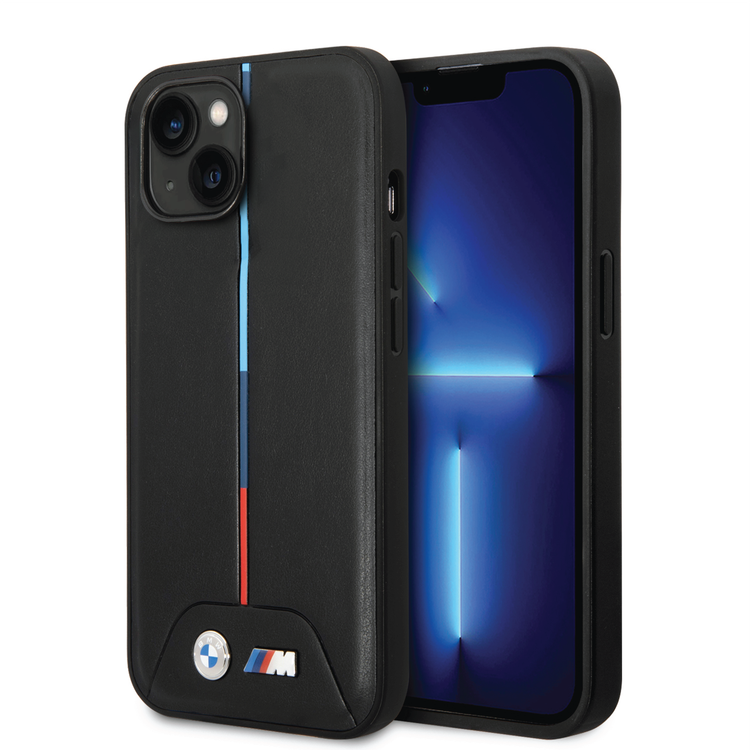 BMW M Collection Quilted PU Case with Hot Stamped Tricolor Stripe and Printed Logo iPhone 14 Compatibility - Black