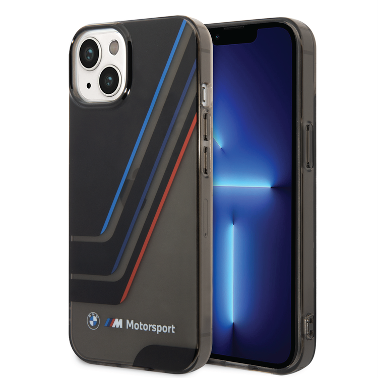 BMW Motorsport Collection PC/TPU IML Printed Tricolor Stripes, Translucent Zones Bumper Protection iPhone 14 Compatibility - Black