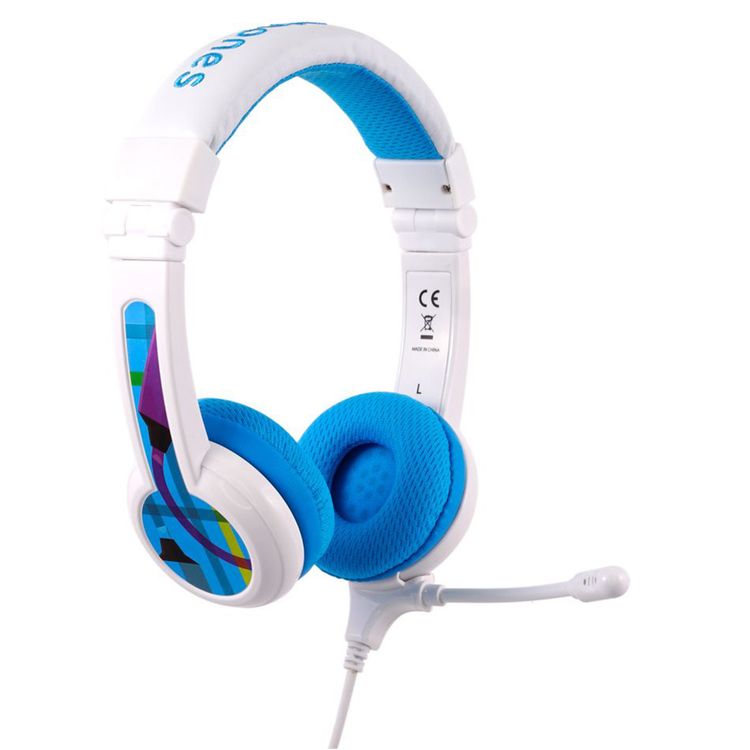BuddyPhones School+ Wired Kids Headphones with Built-In BuddyJack for Sharing, Custom Name Tags, Soft Travel Bag, 8 Hours Battery Life - Blue