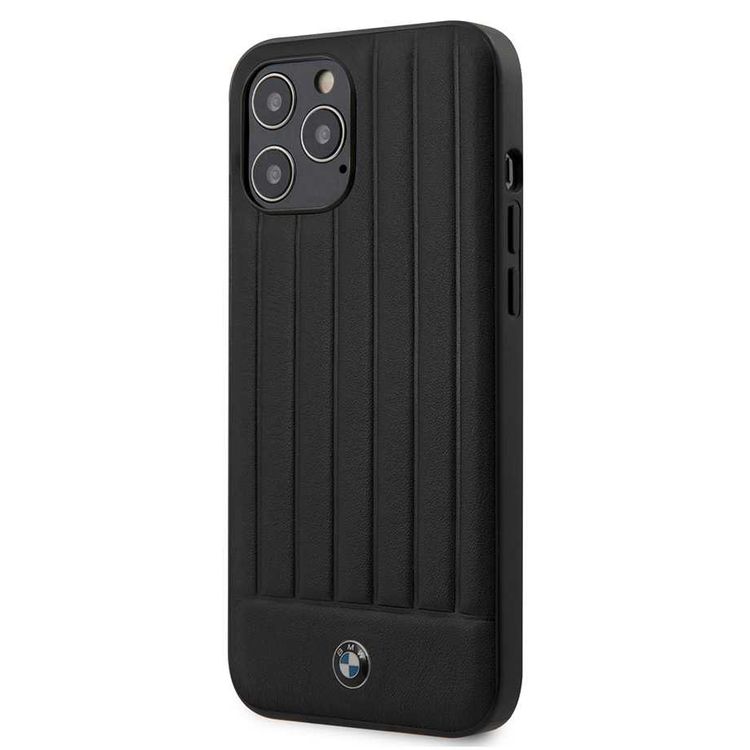 CG Mobile BMW PC/TPU Shiny Hard Case Genuine Leather with Vertical Hot Stamped Lines Compatible for iPhone 12 Pro Max (6.7") Drop Protection Back Cover Officially Licensed - Black