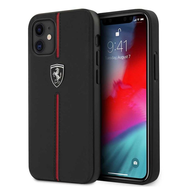 CG Mobile Ferrari Off Track Genuine Leather Hard Case with Contrasted Stitched Nylon Middle Stripe for iPhone 12 Mini (5.4") Officially Licensed, Shock Resistant - Black