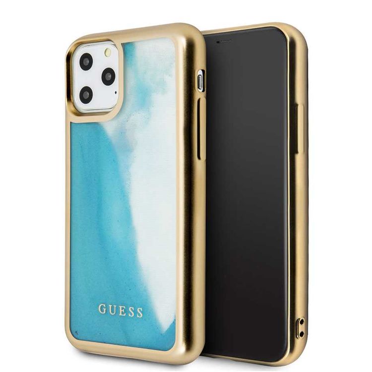 CG MOBILE Guess Glow Dark TPU Case Compatible with iPhone 11 Pro, Fit & Lightweight, Supports Wireless Charger, Easy Access to All Ports, Officially Licensed - Matte Gold/Blue