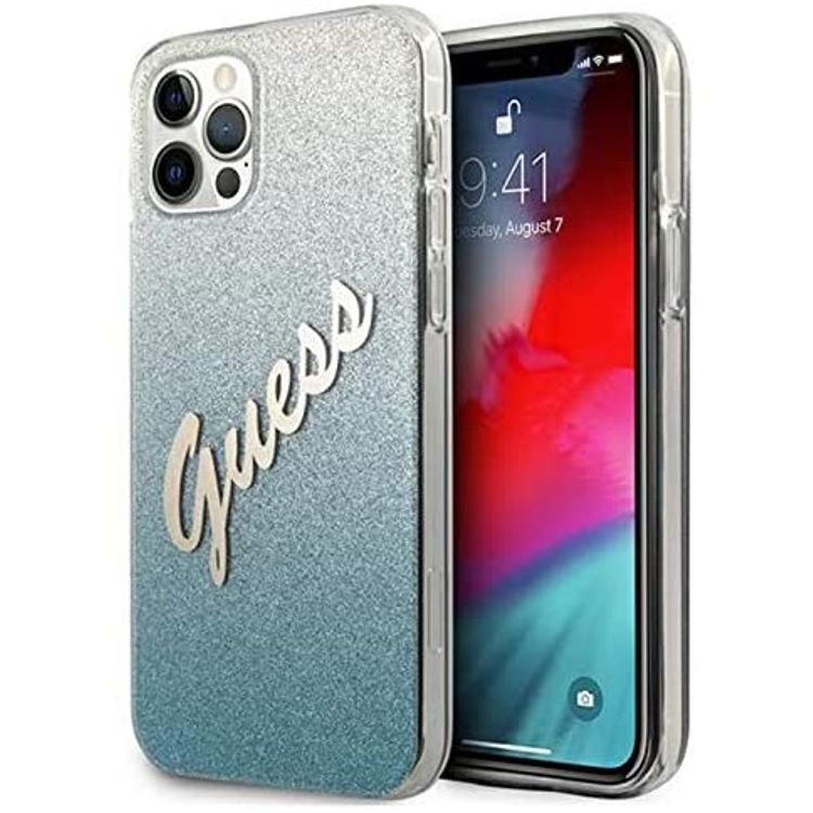 CG MOBILE Guess HC PC/TPU Script Glitter Back Shield Hard Phone Case Compatible for Apple iPhone 12 Pro Max (6.7") Shock-Absorption Mobile Case Officially Licensed - Gradient Blue