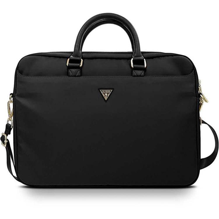 Guess Nylon 15" Laptop Bag with Metal Triangle Logo, Carrying Handles, Adjustable Shoulder Strap, Multiple Pockets, High-Quality Nylon & Polyester Material - Black