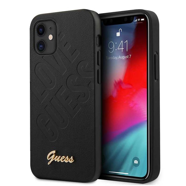 CG MOBILE Guess PU Iridescent "LOVE" Debossed Phone Case with Metal Logo Compatible for iPhone 12 Mini (5.4") Drop Protection Mobile Case Officially Licensed - Black