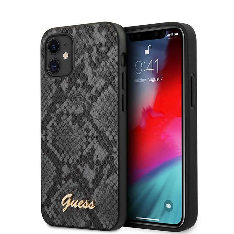 CG MOBILE Guess PU Python Pattern Phone Case with Metal Logo Compatible for iPhone 12 Mini (5.4") Mobile Case Suitable with Wireless Charging Officially Licensed - Black