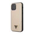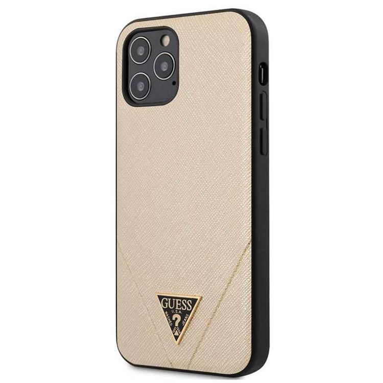 CG Mobile Guess PU Saffiano V Stitched w/ Metal Logo Case, Shock-Absorption & Drop Protection for iPhone 12 Pro Max (6.7") Officially Licensed - Light Gold