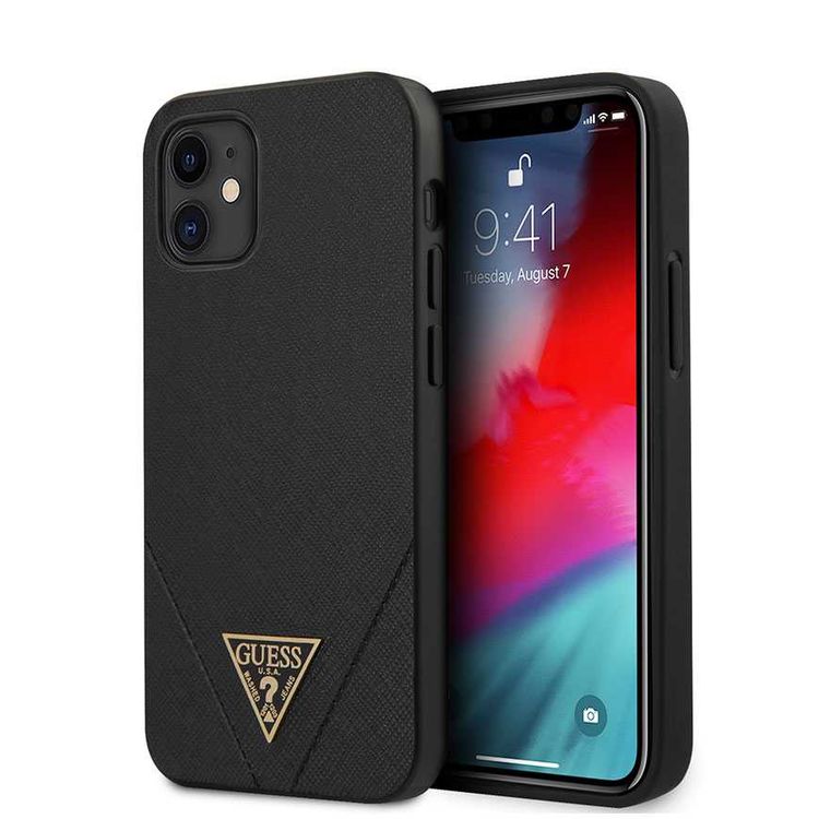 CG Mobile Guess PU Saffiano V Stitched w/ Metal Logo Case for iPhone 12 Mini (5.4") Officially Licensed, Shock Resistant, Scratches Resistant, Easy Access to All Ports, Cameras - Black