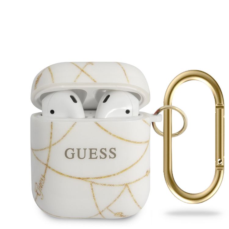 CG MOBILE Guess TPU Chain Case with Anti-Lost Carabiner Compatible for AirPods 1/2 Scratch Resistant, Shock Absorption, Drop Protection, Dustproof Protective Silicone Cover Officially Licensed - White