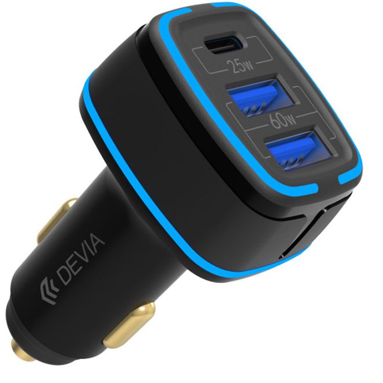 Devia Extreme Speed Dual USB+TYPE-C Full Compatible Fast Car Charger 85W, Soft LED Indicator, 3 Ports All Quick Charge, USB1 & USB2 & Type-C, 12V-24V Wide Voltage Input - Black