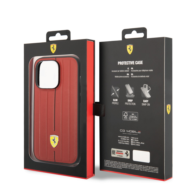 Ferrari Leather Case With Embossed Stripes & Yellow Shield Logo - iPhone 14 Pro Max - Red