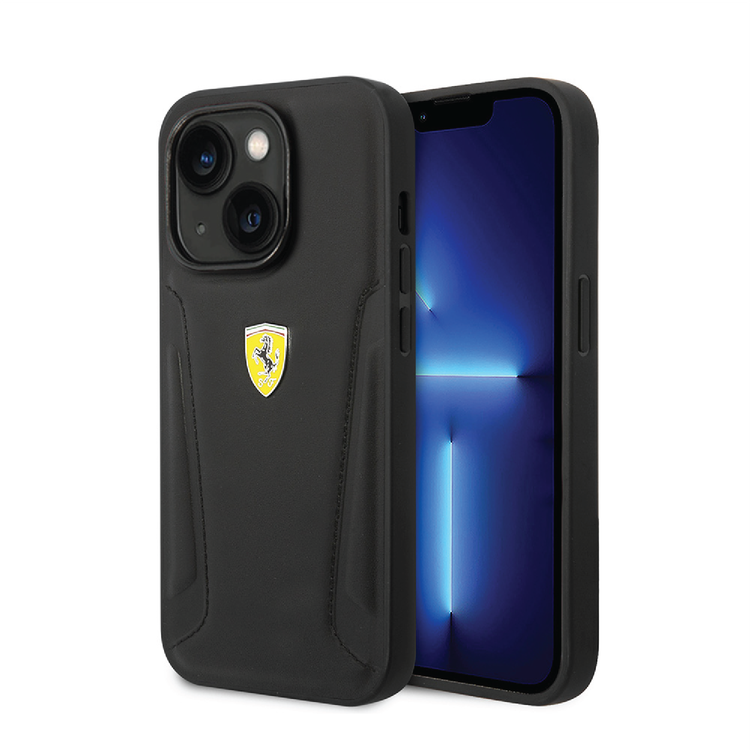 Ferrari Leather Case With Hot Stamped Sides & Yellow Shield Logo - iPhone 14 Plus - Black