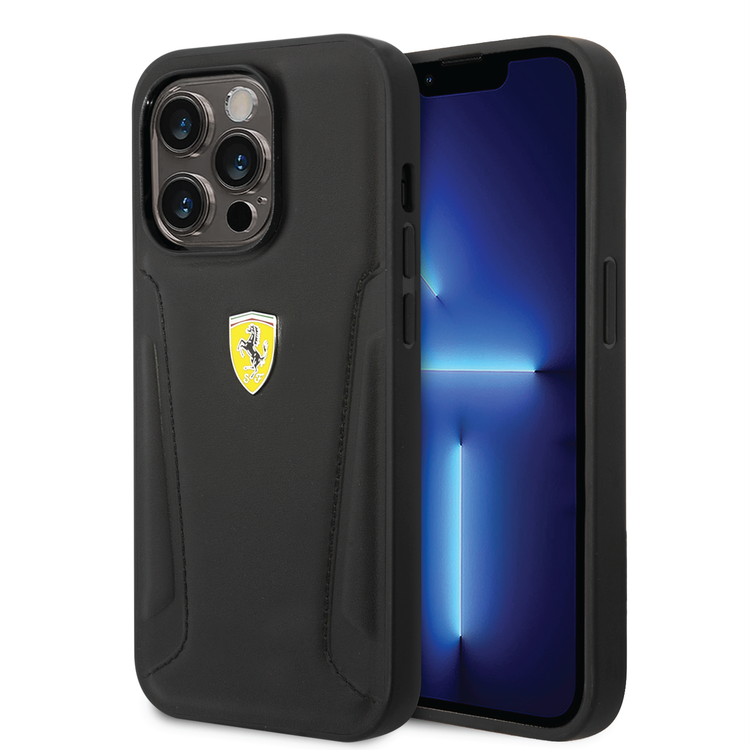 Ferrari Leather Case With Hot Stamped Sides & Yellow Shield Logo - iPhone 14 Pro - Black