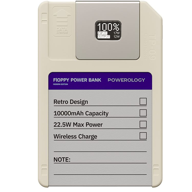 Powerology Floppydisk Retro 10000mAh MagSafe Powerbank with OLED Display Screen, Multi-Protocol Fast Charging, Universal Compatibility, 64GB Storage Capacity, High-Speed Data Storage, Fire-Resistant PC Material - White
