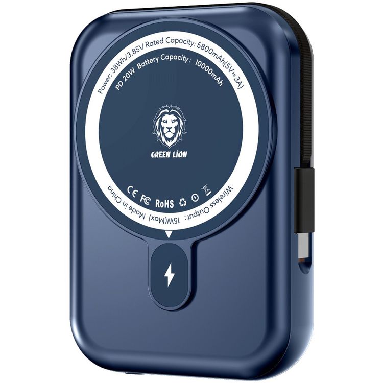 Green Lion 10000mAh Monaco MagSafe Power Bank with Built-in Type-C Cable, 20W Power Delivery, LCD Power Indicator, 15W Wireless Output, Smart Chip - Titanium Blue