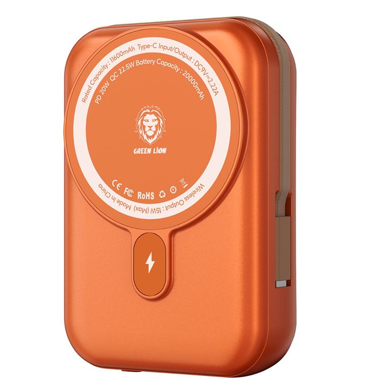 Green Lion 20000mAh Monaco MagSafe Power Bank with Built-in Type-C Cable, LCD Display, 20W Power Delivery, Magnetic Attraction, Compact Design - Orange
