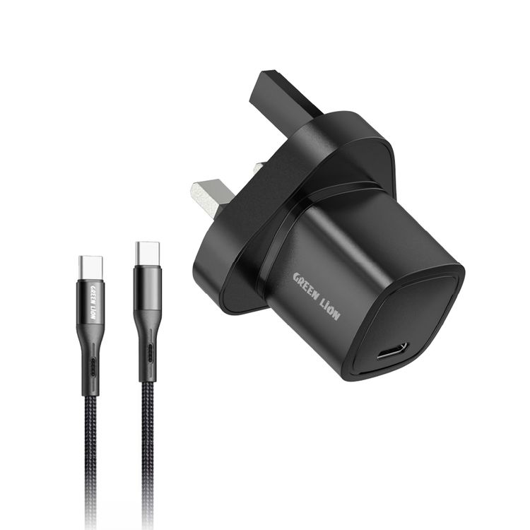 Green Lion Mini UK Charger with Type-C to Type-C Cable, 20W Power Delivery, 100-240V Input Voltage, Multiple Protections, Fast Charging Support, Compact & Lightweight Design - Black